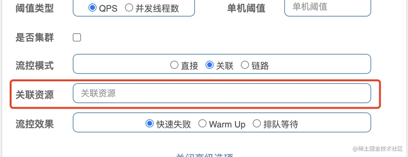 关联的意思就是当关联资源的ClusterNode统计的qps达到了设置的阈值时,就会触发当前资源的限流操作。