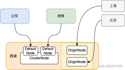 不同入口的访问数据就叫他DefaultNode,统计所有入口访问数据之和就叫他ClusterNode,来自某个服务的访问数据就叫他OriginNode。