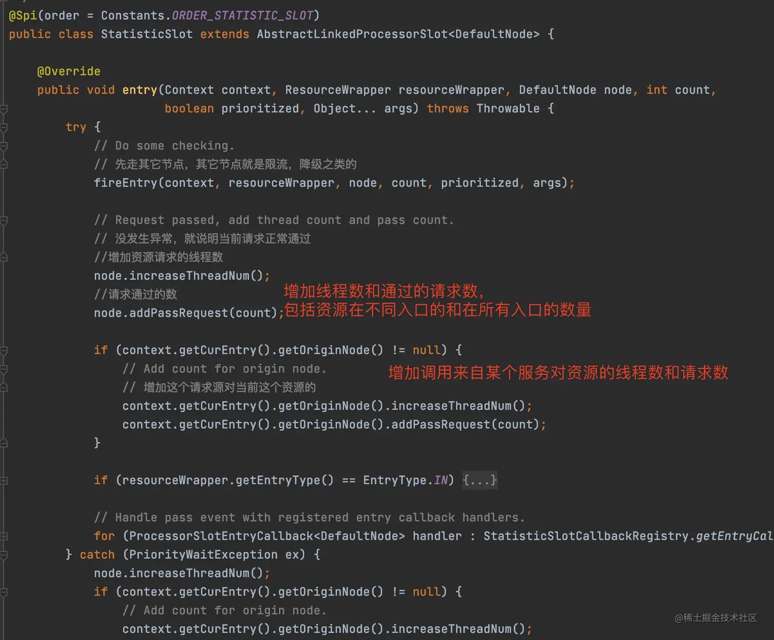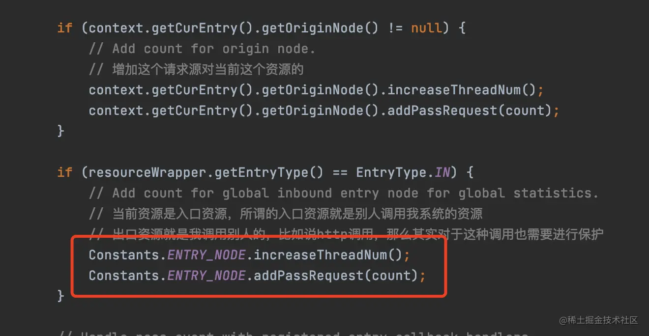 对于系统的入口qps、线程数、平均响应时间这些指标,也会有一个统计Node专门去统计,所以这个统计Node的作用就好比会去统计所有访问西湖的人数,统计也在StatisticSlot代码中,前面说的时候我把代码隐藏了