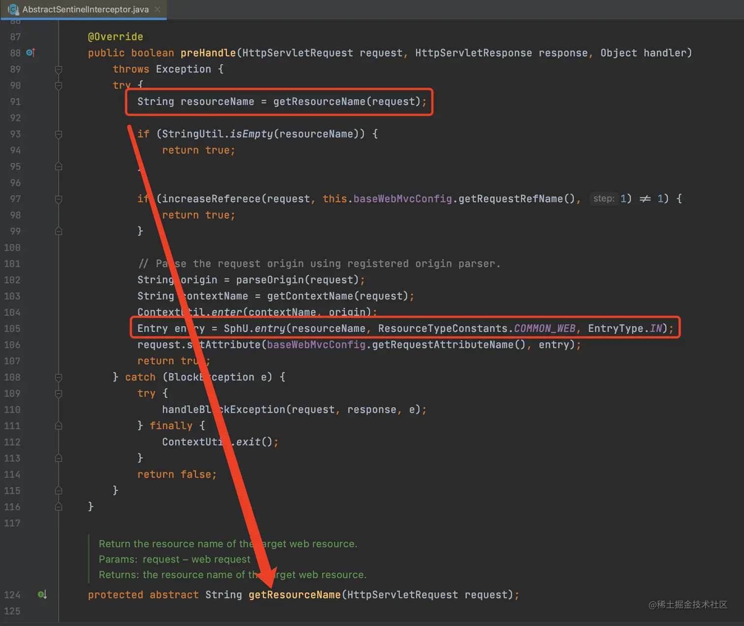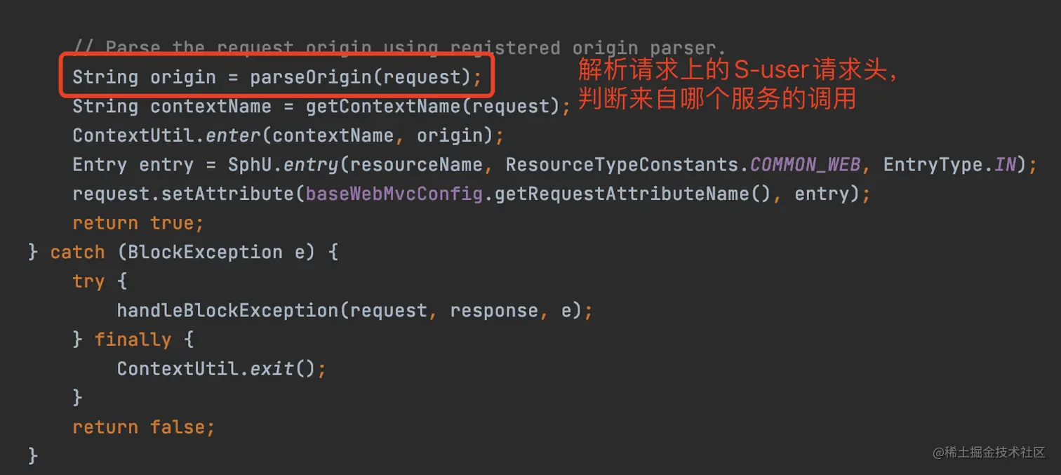 而真正的原因是Sentinel实现了SpringMVC中的HandlerInterceptor接口,在调用Controller接口之前,会将一个调用接口设置为一个资源,代码如下