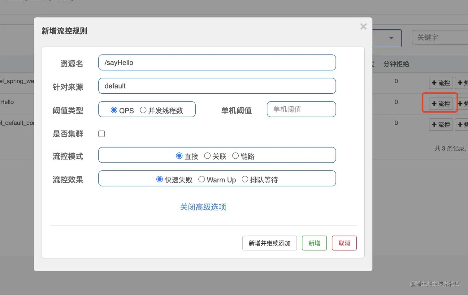 最后一个配置项,流控效果,这个就是如果是通过qps来限流,并且达到了限流的条件之后会做什么,如果是线程数,就直接抛出BlockException异常