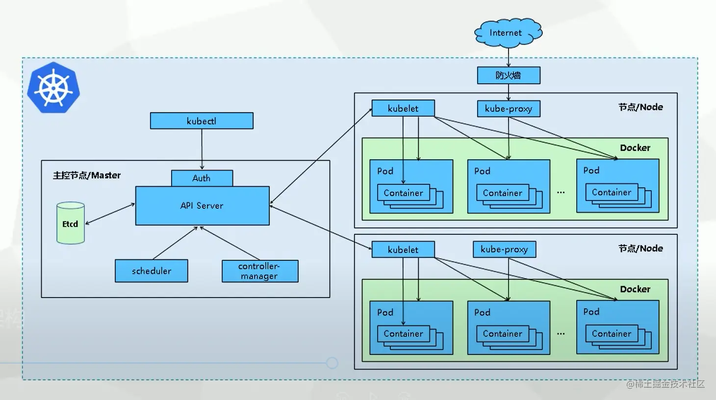 - Apiserver:上知天文下知地理,上连其余组件,下接ETCD,提供各类 api 处理、鉴权,和 Node 上的 kubelet 通信等,只有 apiserver 会连接 ETCD。