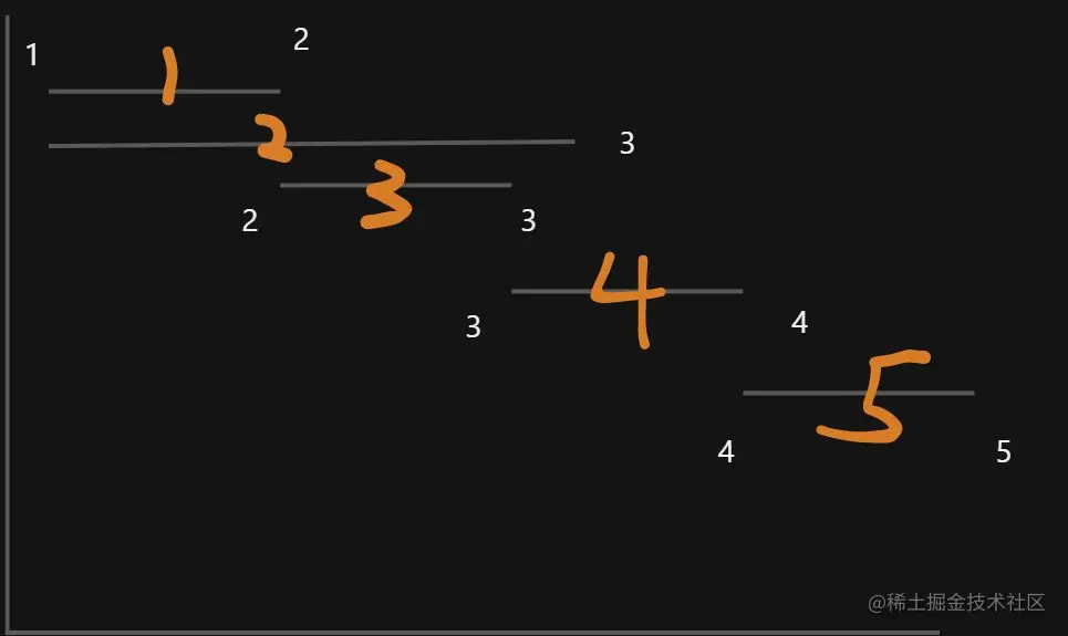 这里记录非交叉区间的个数还是有技巧的,以 [ [1,2], [2,3], [3,4], [1,3] ] 为例子,排序后如图: