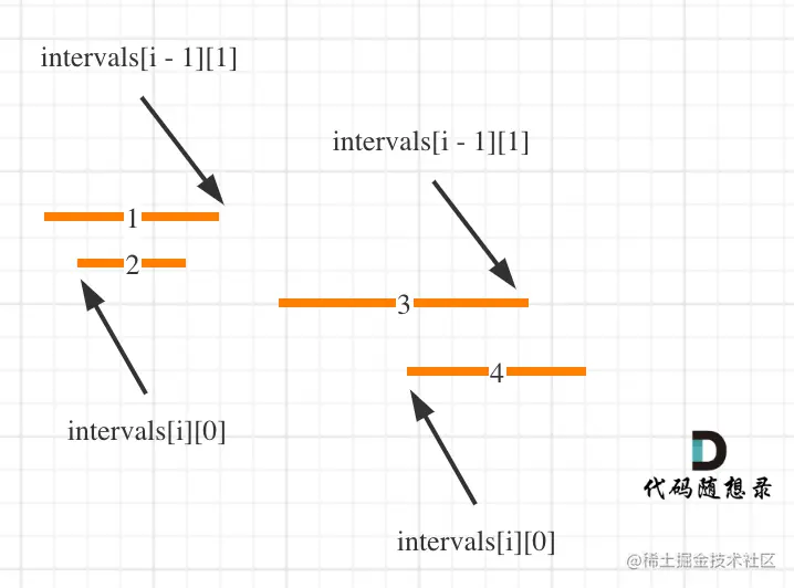 按照左边界从小到大排序之后,如果 intervals[i][0] <= intervals[i - 1][1] 即intervals[i]的左边界 <= intervals[i - 1]的右边界,则一定有重叠。(本题相邻区间也算重贴,所以是<=)