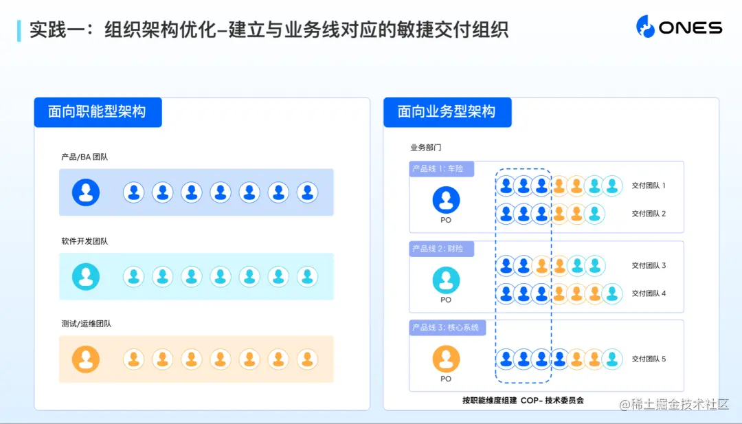 **首先是科技组织架构的优化,**也就是根据业务形态和资源规模,将架构由「面向职能型」调整为「面向业务型」,建立与业务线对应的敏捷交付组织。可以参考下图: