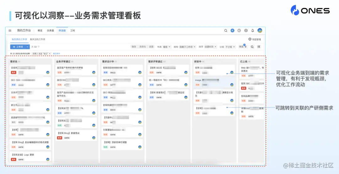 **三层结构促进了高效的分工和协作。**比如通过管理看板,可以将业务的需求价值流全部可视化出来,让所有干系人能拥有端到端的全局视角:从提出业务需求到业务上线,每个人都能看到过程中的瓶颈以及对业务的影响。