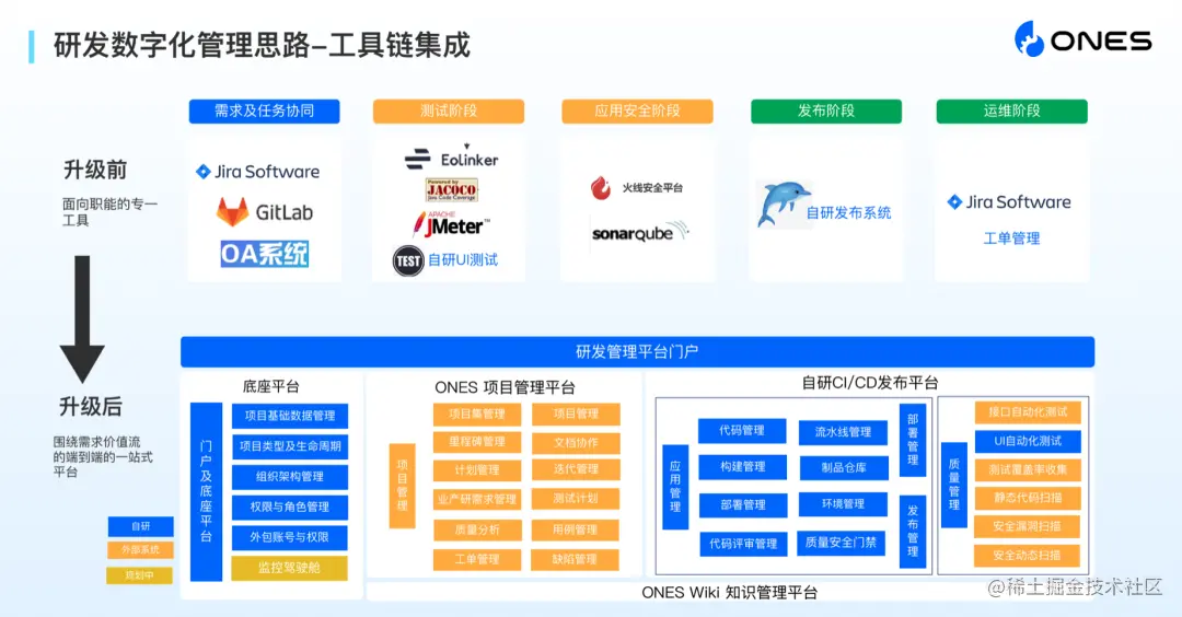 归根结底,第二阶段就是要通过各种手段将工具链集成,完全落地组织级流程规范。从图中可以看到,在升级前,工具链是面向职能的专一工具,也就是说各个职能所用的工具又不统一,十分分散,导致项目数据孤立,于是我们决定进行升级。