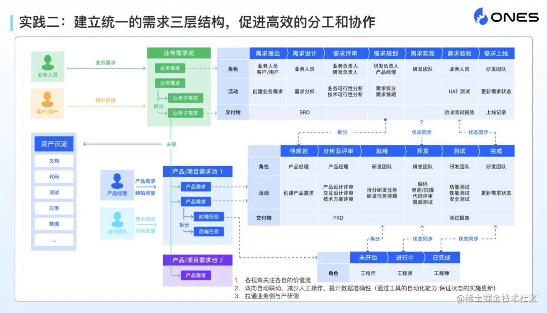 **第二个实践是建立了统一的需求三层结构,**拉通业务侧与产研侧,以促进高效的分工和协作。