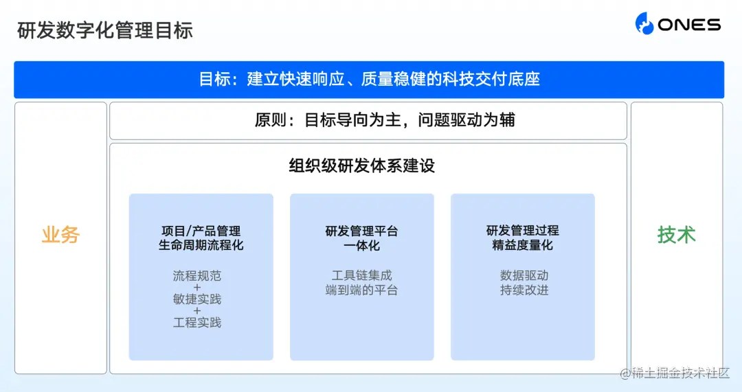 针对上述问题,我们与客户共同制定了此次研发管理升级的总目标:通过搭建组织级研发体系,融合业务和技术,建立快速响应、质量稳健的科技交付底座。当落地方案时,我们也采取了「目标导向为主,问题驱动为辅」的原则,确保改进方向不迷失。