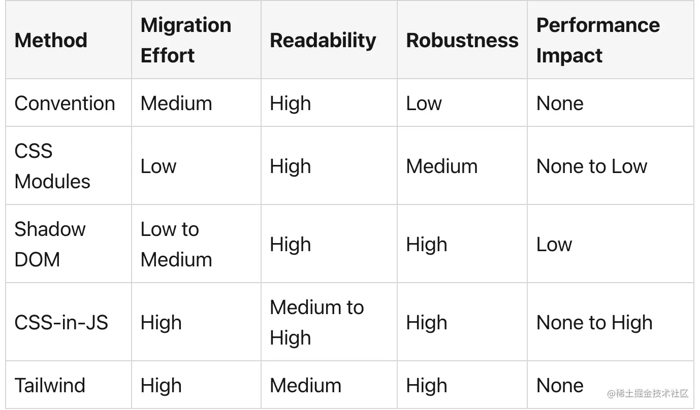 到目前为止,所提出的几种方法都是微前端的可行选择。总的来说,这些解决方案也可以混合使用。一个微前端可以采用Shadow DOM方法,而另一个微前端可以使用Emotion。第三个库可能会选择Vanilla Extract。 最重要的是所选择的解决方案不会产生冲突,并且没有(巨大的)运行时成本。虽然有些方法比其他方法更高效,但它们都提供了所需的样式隔离性。 性能影响在很大程度上取决于实现方式。例如,对于CSS-in-JS,如果解析和组合都在运行时完成,可能会产生很大的性能影响。如果样式已经预解析,只在运行时组合,则可能性能影响较小。对于类似Vanilla Extract这样的解决方案,几乎没有任何性能影响。
