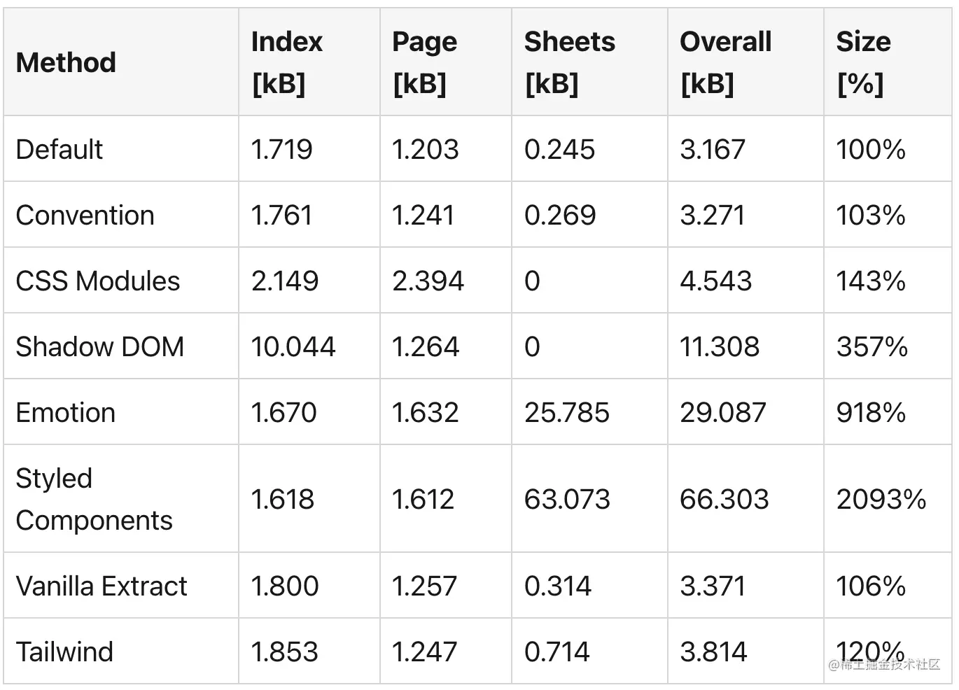对于 Shadow DOM,主要的性能影响可能是 Shadow DOM 内部元素的投影或移动(本质上为零)以及标签的重新评估style。然而,这是相当低的,甚至可能会产生一些性能优势,给定的样式总是切中要害,并且仅专用于要在Shadow DOM 中显示的某个组件。 在示例中,我们有以下捆绑包大小: 对于Emotion和Styled Components,这些数字仅供参考,因为运行时可能(并且很可能应该)被共享。此外,给定的微前端示例确实很小(所有UI片段的总大小为3KB)。对于一个更大的微前端,增长肯定不会像这里描述的那样成为问题。