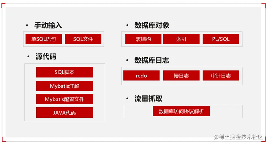 SQL获取:即我们能从哪些渠道获取到需要审核的SQL, 获取能力决定了我们能否对开发中的代码做更全面的审核;