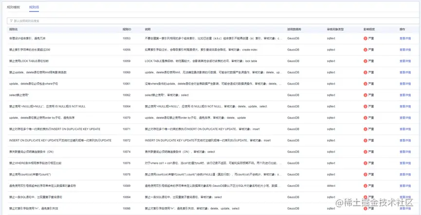 审核的核心是审核规则,而审核规则的核心是对数据库的理解+对客户业务开发理解的实践经验总结,我们结合GaussDB数据库的最佳实践+公司内外部客户的实际使用场景,整理出审核规则数百条,目前产品中已支持规则78条,包含了SQL开发过程中常见的规范和性能问题,后续会有更多的规则持续丰富到产品中。