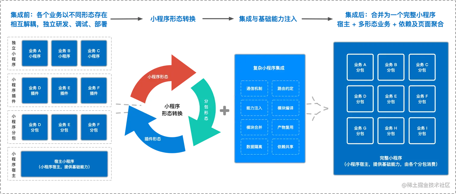 将小程序宿主和各个业务模块(分包、小程序、插件)通过形态转换、拉包、编译、构建、合并等一系列处理后,合并为一个完整小程序,且根据不同的场景可以支持: