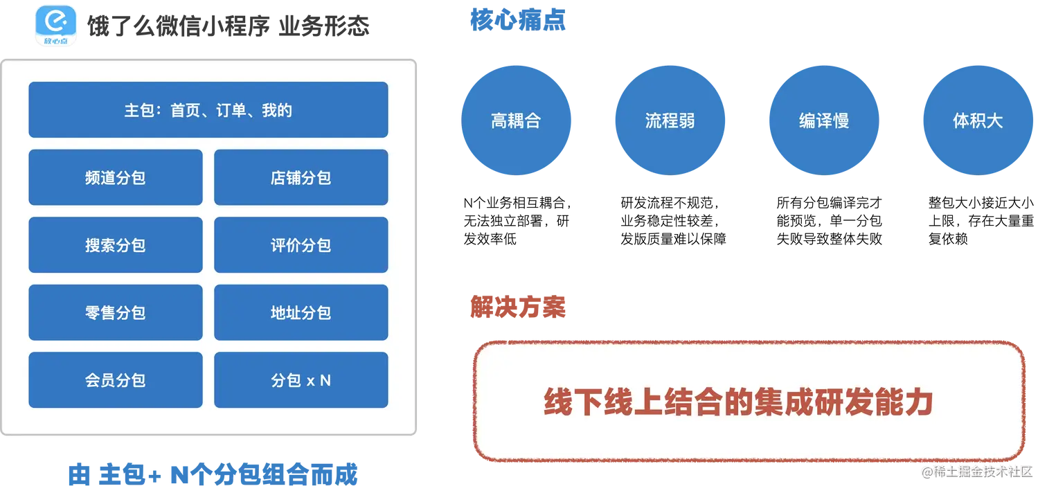 - 工程复杂导致研发效率低:大量的团队在一个单体小程序应用上研发,带来的直接问题就是小程序巨大化带来的研发体验差和编译效率低,且业务相互依赖,单一模块构建失败会引发整个项目的失败,比如饿了么微信小程序单次编译的时间超过了半个小时,且体积逼近 20m 上限