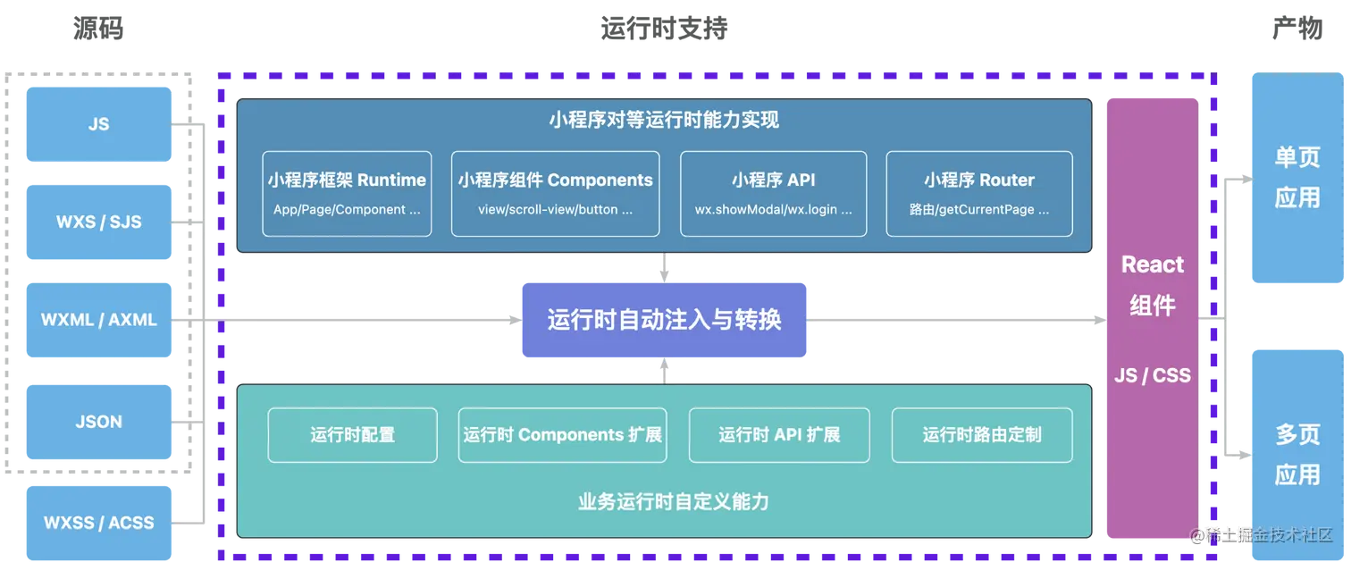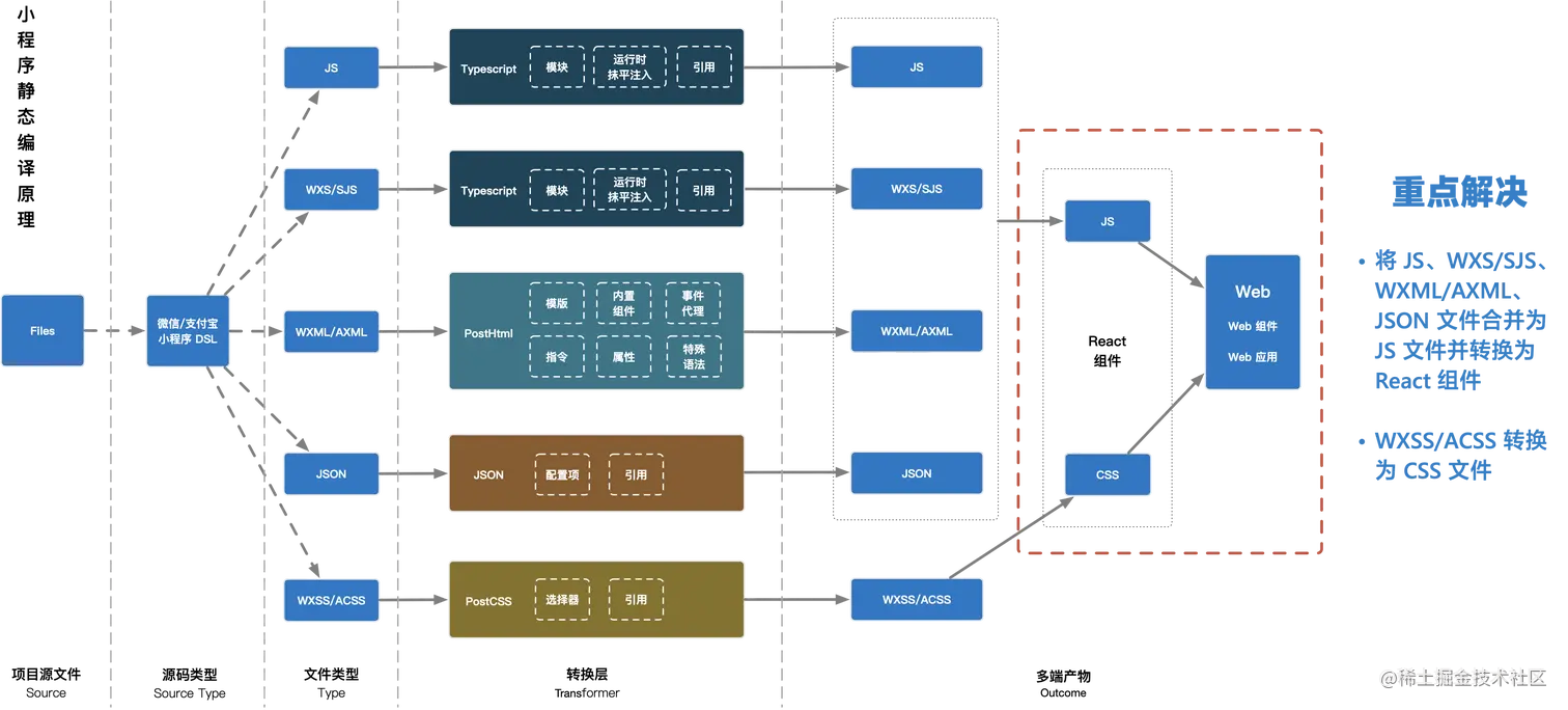 编译部分和小程序转小程序的主要区别和难点是:需要将 JS、WXS/SJS、WXML/AXML 等文件统一转换并合并为 JS 文件并将 WXML/AXML 文件转换为 JSX 语法,将样式文件统一转换为 CSS 文件,并将小程序的页面和组件都转换为 React 组件。