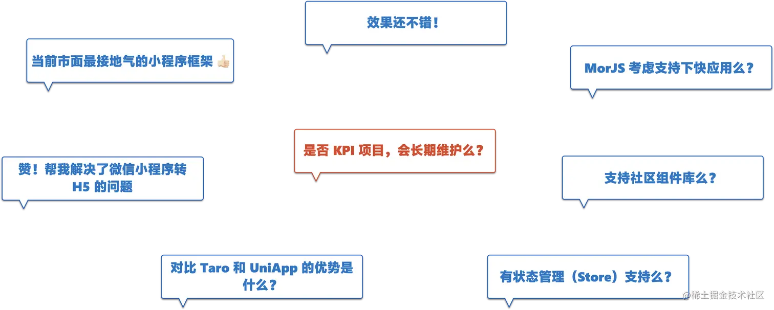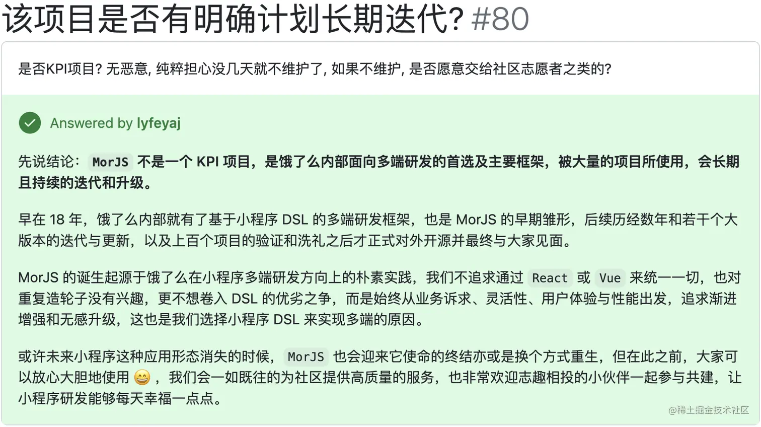MorJS 上线的这几个月里面,我们收到了一些社区用户的正向反馈,也收到了一些诉求和问题,其中用户最担心的问题是:MorJS 是不是 KPI 项目,是否会长期维护?