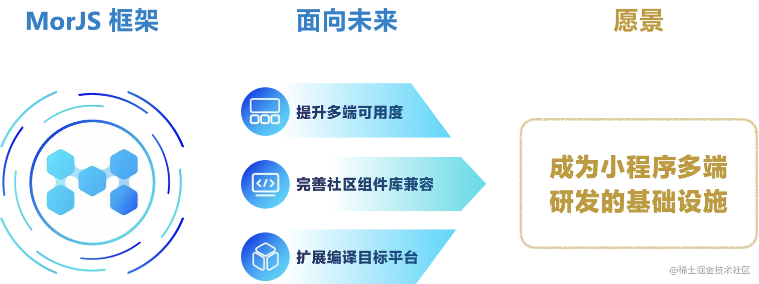 未来,在现有的 MorJS 的能力基础上,我们会进一步完善已有的多端能力,提升多端转换可用度,完善对各类社区组件库的兼容,并持续扩展编译目标平台的支持(如 鸿蒙、快应用等),在持续为饿了么自身业务和社区用户提供高质量服务的同时,期望有朝一日 MorJS 可以成为业界小程序多端研发的基础设施之一。