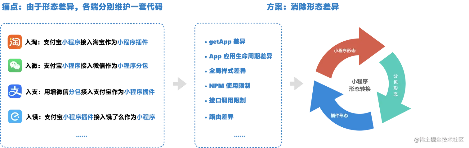 虽然我们已经具备了多端的能力,但是形态的差异没有解决掉,而之前相关业务的做法是,尽可能将通用功能沉淀到组件库,并按照多端的方式分端输出产物,然而由于相同业务在不同小程序端形态差异性的问题,业务上难以自行规避,而重构的成本又比较高,所以有一部分业务选择了直接按照不同的端不同的形态(如微信、支付宝、淘宝、抖音)各自维护一套代码,但这样做不仅功能同步迭代周期被拉长,而且 BUG 较多,维护困难,研发过程也是异常痛苦。