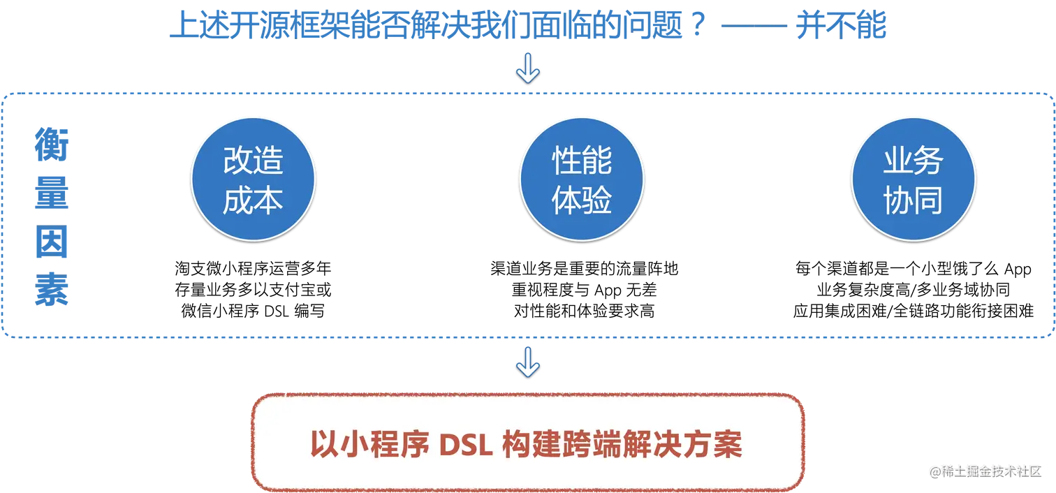 - 改造成本:以支付宝、微信、淘宝为代表的饿了么小程序运营多年,大部分存量业务是以支付宝或微信小程序 DSL 来编写,需关注已有业务逻辑(或组件库)的改造成本,而采纳业界框架基本上会直接引发业务的大量重构,这个改造成本是难以接受的。