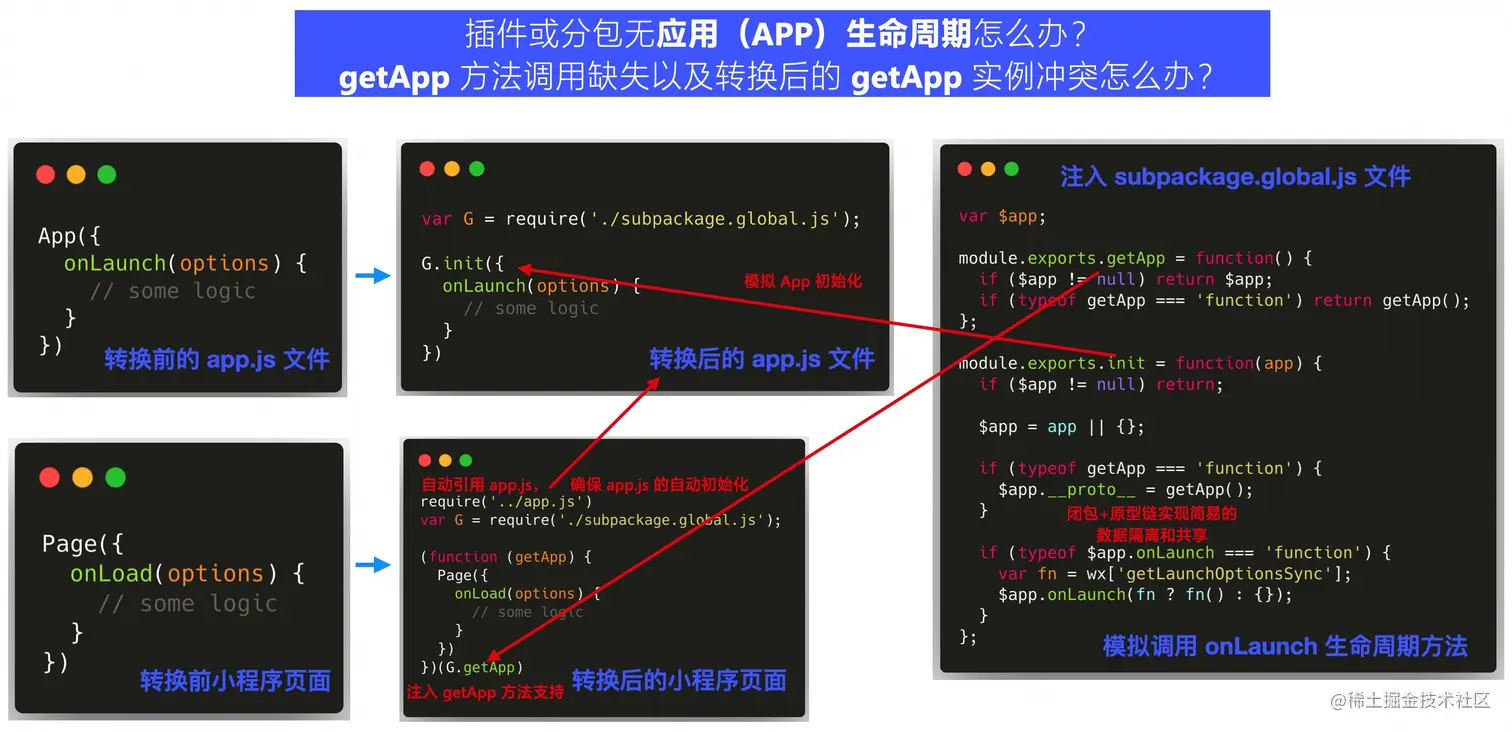 通过在编译过程中,自动向产物中注入对 App 和 getApp 的运行时模拟实现,这样就可以解决分包和插件下方法缺失或者是冲突引起的报错问题。
