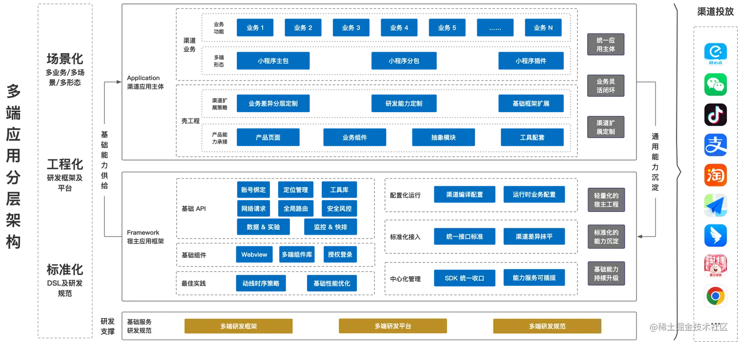 基础服务与研发规范:最底部的是基础服务与研发规范,由 多端研发框架、多端研发平台和多端研发规范,来提供统一的研发支撑,保障业务研发的基础能力、体验和效率,并负责将相关的业务统一打包、封装、集成,并部署和投放到不同的渠道;