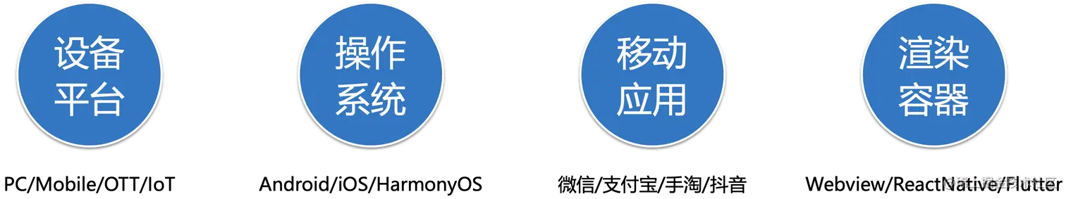 - 跨渲染容器,如 Webview/React Native/Flutter。前面三类场景催生了针对不同设备平台、不同操作系统、不同 App 间解决方案,因而移动领域的各种 Native 化渲染、自绘渲染与魔改 Webview 的方案也由此被设计出来,在尝试解决跨端问题的同时,也一定程度上提高了跨端的迁移门槛和方案选择难度。