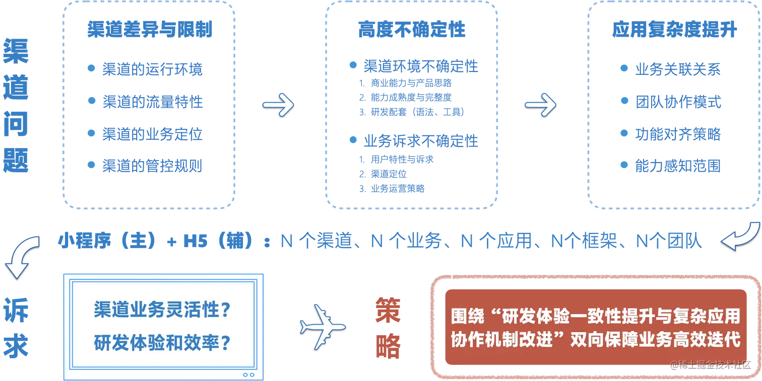 - 渠道环境的高度不确定性:对接了这么多渠道,每个端的运行环境存在巨大差异,拿小程序能力举例,即使是个别 APP 的小程序方案借鉴了微信的思路,由于其内部商业能力、产品设计思路、能力成熟度与完整度、研发配套(语法、框架、工具等)的不一致也会使研发体感有明显的不同,这对技术同学来说,带来的是渠道环境的高度不确定性;