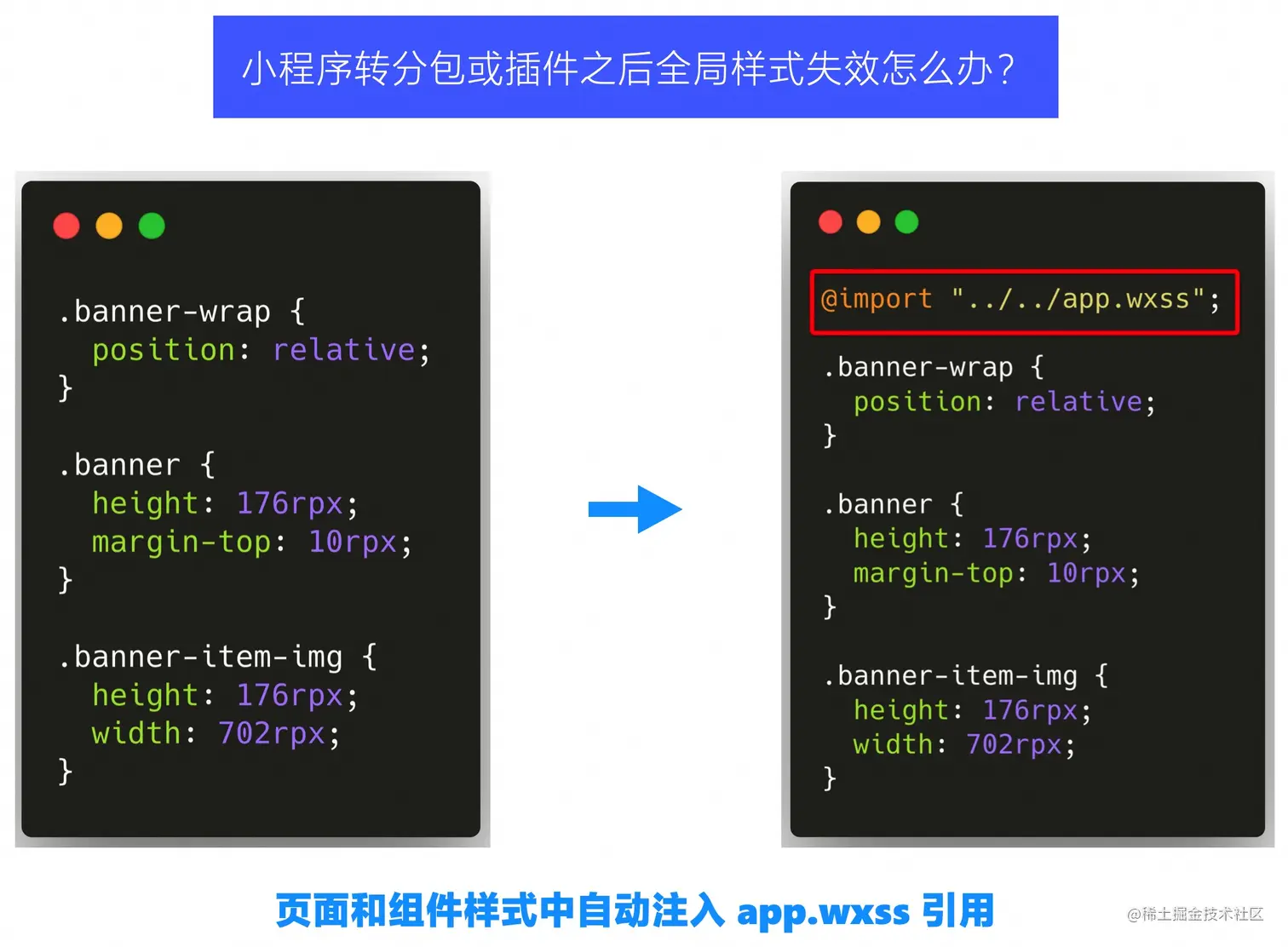 方法也是类似,可以在编译的过程中检测全局样式是否存在,如果存在,则将对应的全局样式引用自动注入到每一个页面和组件中来解决全局样式失效的问题。