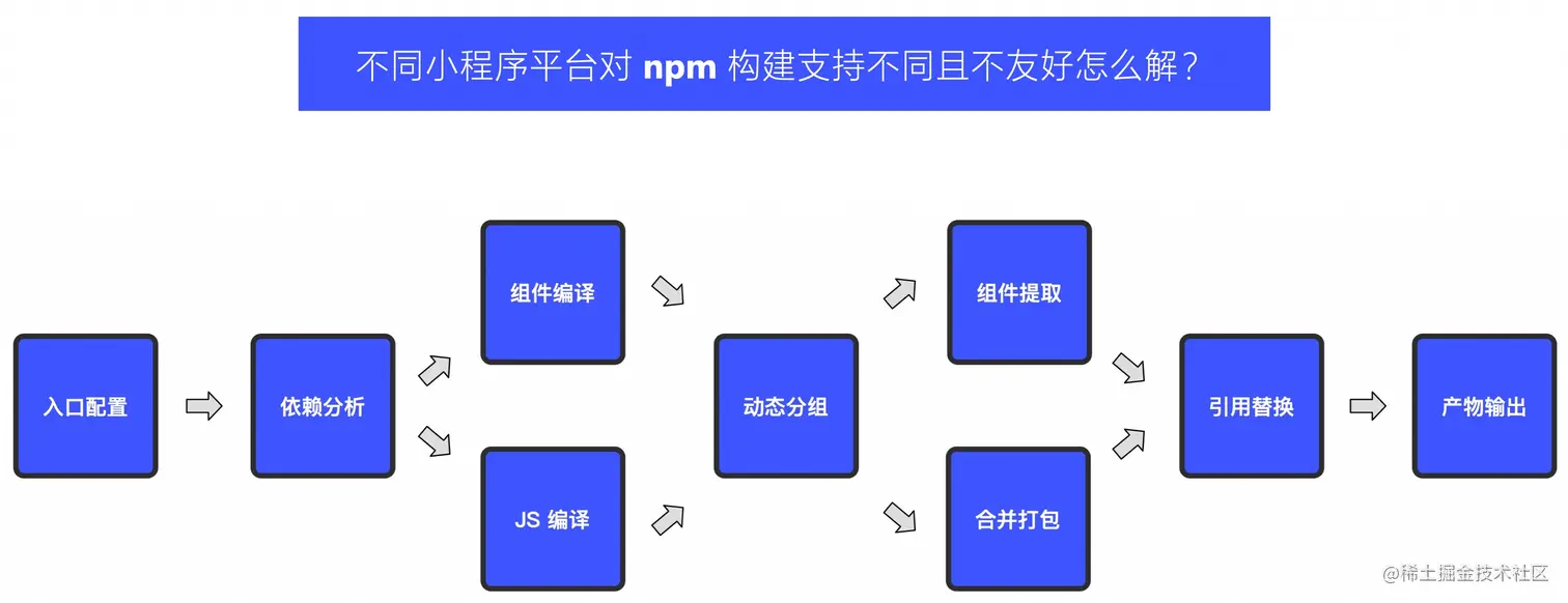 而针对各个小程序平台的 NPM 使用规则不同的问题,可以通过依赖解析、动态分组、组件提取打包、引用替换等方式,将 NPM 抽取到特定的地方,并将对应的组件和页面中的引用进行替换,来解决 NPM 的支持问题,这样业务就可以基本无脑使用各类 NPM 而不用关心平台差异。