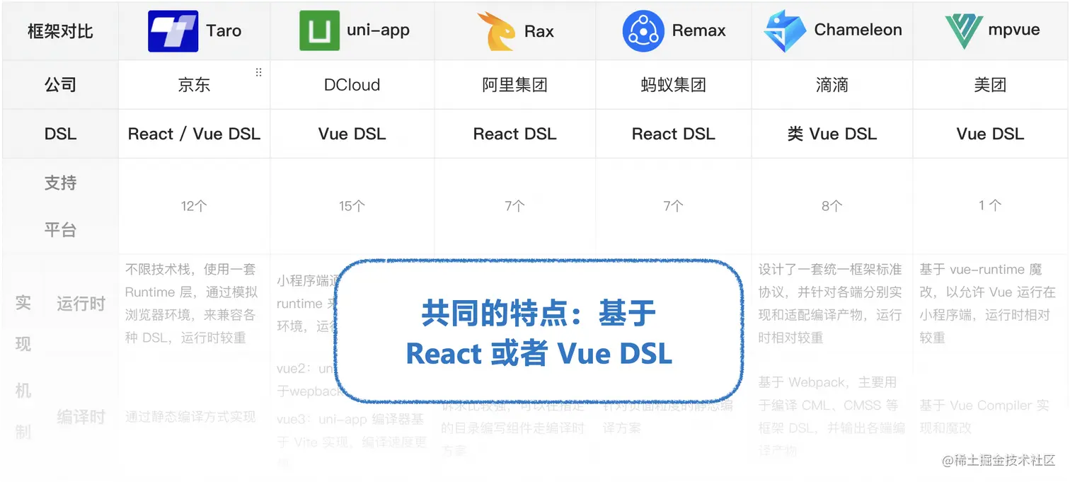 市面上,从小程序视角出发,具备类似能力的优秀多端框架有很多,有代表性的如 Taro、uni-app、Rax 等,大多以 React 或者 Vue 作为 DSL