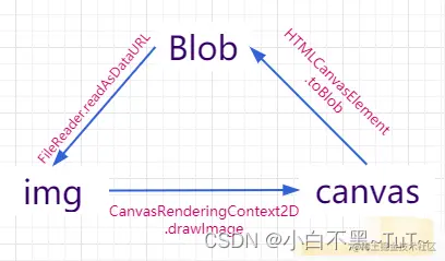 我们在上传文件到后端的时候,使用input标签读取用户本地文件后得到的其实是一个Blob对象(更精确的说是File对象,特殊的Blob对象);而在页面上展示一个图片使用的是img标签;绘制功能用canvas实现。添加水印的功能需要在img标签、canvas画布、Blob对象这三者之间相互转换,通过一些API可以完成这个工作:
