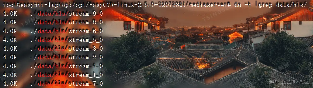 于是我们对EasyCVR程序目录进行排查,发现/data/hls目录下都是切片,咨询用户是否存在录像,用户表示并未配置录像,并且取的是hls流进行集成。得知情况后,我们立即明白了问题的根源:使用hls流会产生切片,会保存一个小时,用户集成取的是hls流,通道数也较多,所以导致磁盘被切片占满。