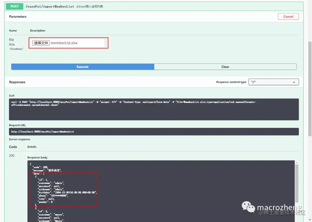 然后在Swagger中测试接口,选择之前导出的Excel文件即可,导入成功后会返回解析到的数据。