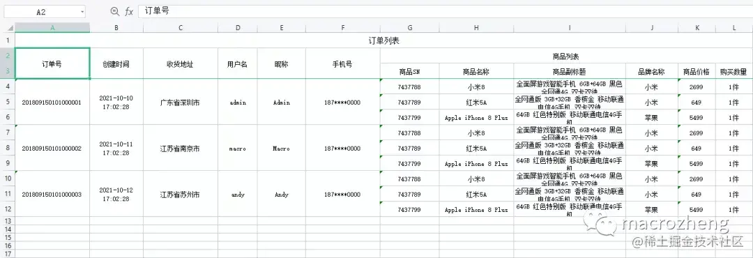 当然EasyPoi也可以实现更加复杂的Excel操作,比如导出一个嵌套了会员信息和商品信息的订单列表,下面我们来实现下!