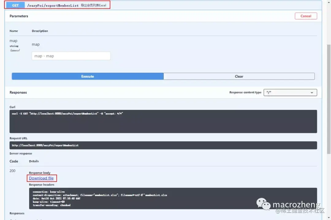 - 运行项目,直接通过Swagger访问接口,注意在Swagger中访问接口无法直接下载,需要点击返回结果中的下载按钮才行,访问地址:http://localhost:8088/swagger-ui/