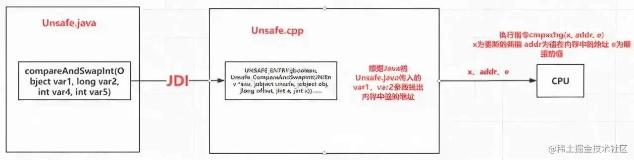 - 接受从Unsafe传递过来的对象引用、偏移量、期望的值和欲更新的新值,根据对象引用和偏移量计算出值的地址,然后将值的地址、期望的值、欲更新的新值传递给CPU