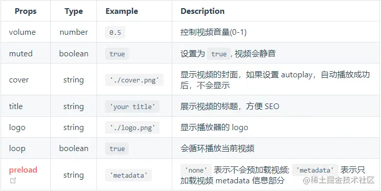 Vue-CoreVideoPlayer的说明文档和sample都很完善,上手十分容易。该组件也保持了和原生HTML Video属性配置的对接,可定制性很高。