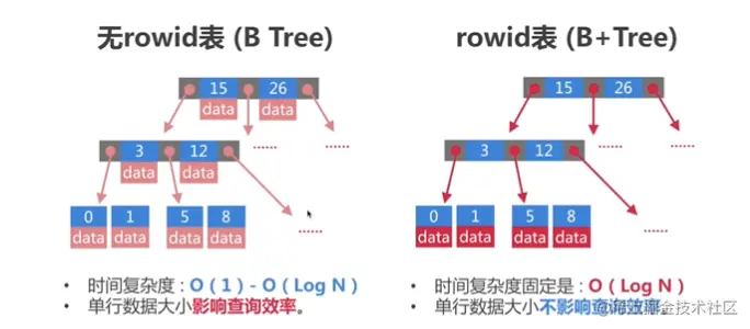 关于rowid表和无rowid表,我们还可以从结构上做一下对比。其实也就是B Tree和B+Tree的区别。除了我们刚刚说过的查询时间复杂度上的区别,它们之间还有一个区别,就是B Tree的单行数据会影响查询效率。因为数据是在每个节点上都存储的,节点越大查询效率也会变得越低。那么B+Tree就不存在这个问题。因为所有的数据都只在叶子节点上当我们通过非叶子的节点去进行查询的时候,直到获取到数据之前,单行数据的大小都不会影响查询效率。