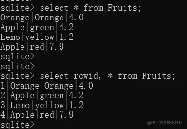 通过select * from Fruits; 查看会发现并不能获取rowid这列数据,因为rowid是隐藏列。必须显式的指定select rowid, * from Fruits 才可以获取rowid列。