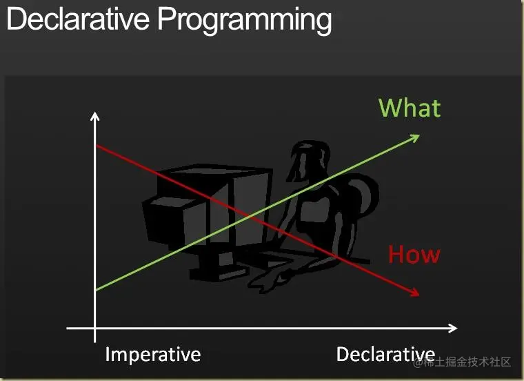 此处为命令式与声明式,命令式强调How to do 而声明式强调 What to do,所以命令式不可避免的比声明式复杂。