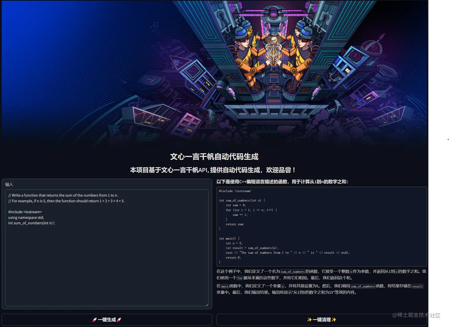 <h2><center>本项目基于文心一言千帆API, 提供自动代码生成,欢迎品尝 !</center></font>""")