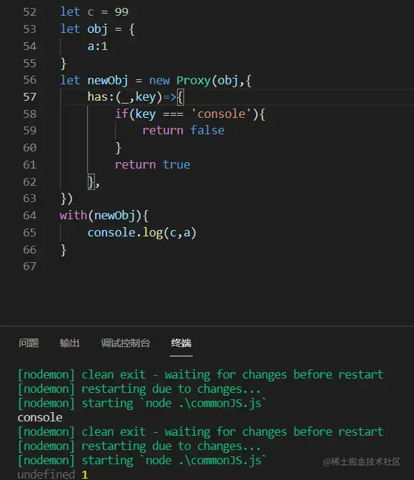可以看到,with是无法截断作用域链,其内部变量会首先在with上作一次for...in循环,找不到时返回false,当为false时,会跳出with向上继续查找。故需要通过Proxy进行下代理