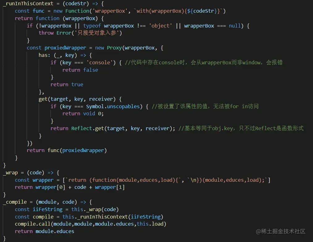模块之间应当是封闭的、隔离的。但是闭包本身是允许通过作用域链向上访问直到全局的(使用new Function已经可以避免访问闭包),故我们需要通过with去劫持作用域,使所有的属性都首先从with劫持的对象(如obj)上尝试获取