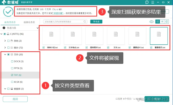 步骤4:软件首次扫描是比较快的,等待扫描结束,通常可以先按文件类型对文件进行查看,但由于展现结果可能比较少,建议点击【深度扫描】获得更多扫描结果;
