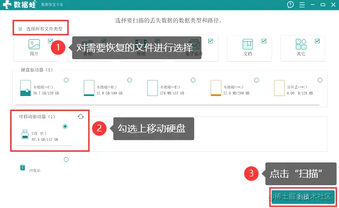 步骤3:在软件主页,可以先对需要恢复的文件类型进行选择,并勾选上移动硬盘,完毕后,点击【扫描】;