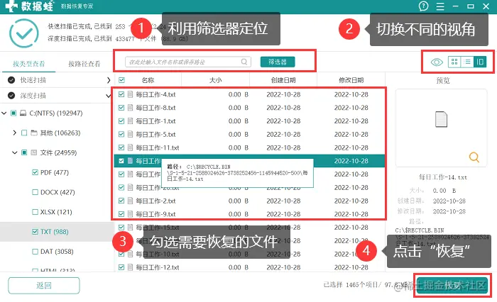 步骤5:软件深度扫描会对整个移动硬盘做全面深入的扫描,因此所花费的时间可能比较长,耐心等待扫描完成,可以借助筛选器或者切换视图等方式,对文件进行定位和选择;