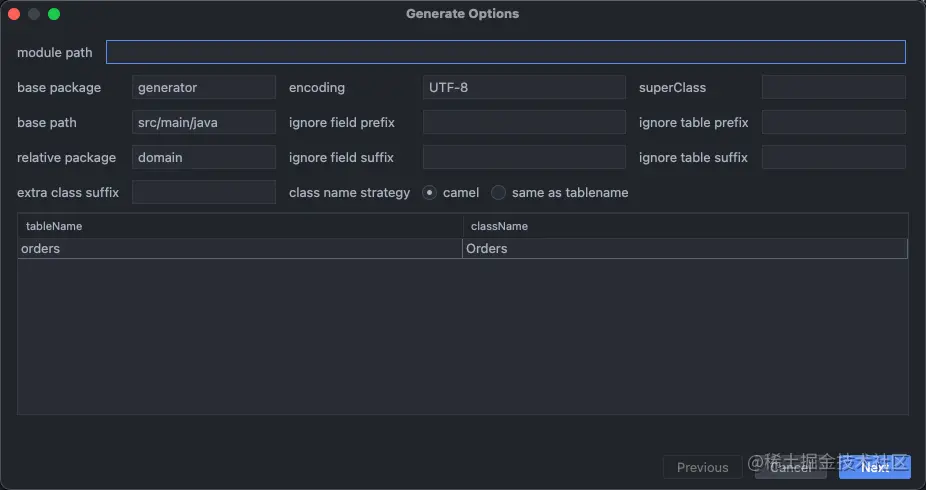 | options | 额外的一些选项。Comment(注释,建议勾选)toString/hashCode/equals(重写这些方法,根据需要勾选)Lombok(使用 Lombok 注解方式,如果使用了 Lombok 建议勾选)Actual Column(实际列名,比如 user_name 列对应的属性也叫 user_name,不勾选就是 userName,不建议勾选)Actual Column Annotation(添加列注解,建议勾选)JSR310:Date API(是否选用新标准的时间 API,建议勾选)Model(是否生成 DTO 模型,根据需要勾选) |