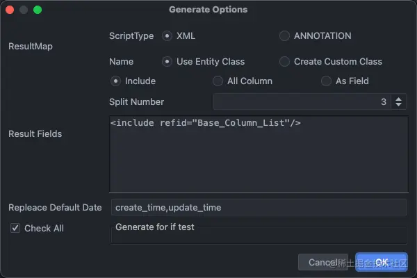 可以生成 Mapper 层、Xml、DTO 代码,并可以指定生成的模板、路径、语句等,非常便捷,是核心功能