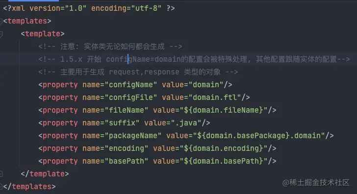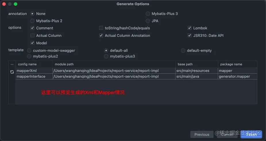 | template | 生成模板。custom-model-swagger(属性上会自动增加 swagger 的相关注解)default-all(生成所有常用的 curd 方法,包括 Mapper 和 Xml)default-empty(生成的 Mapper 和 Xml 没有方法)mybatis-plus2mybatis-plus3 |